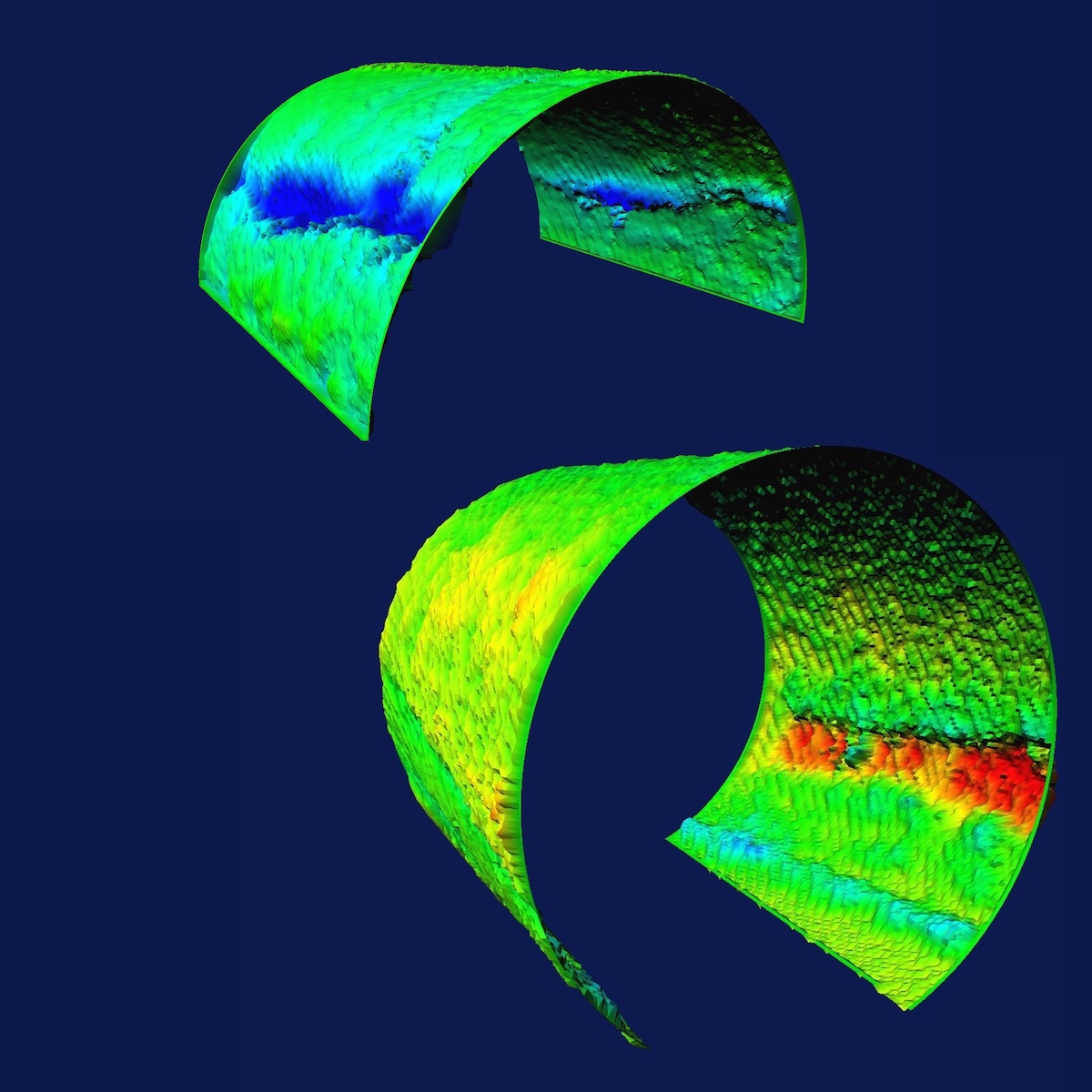 Meshed 3D data from pipe inspection. Blue areas show buildup, red areas show wall corrosion
